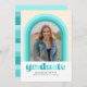 This fun graduation announcement features an arch with different shades of teal around a single photo. The back of the card has a coordinating stripe pattern as well as space for a personal message or invitation details for a graduation celebration.