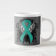 Teal ribbon with angel wings and a filigree pattern. The teal ribbon stands the awareness of Agoraphobia, Anxiety Disorder, Batten Disease, Dissociative Identity Disorder, Ectodermal Dysphasia, Food Allergies, Fragile X, Myasthenia Gravis, Obsessive-Compulsive Disorder, Ovarian Cancer, Tsunami Victims, Tourette's Syndrome awareness, Panic Disorder, Polycystic Kidney Disease, Polycystic Ovarian Syndrome, Scleroderma, Posttraumatic Stress Disorder, Progressive Supranuclear Pals. April is Post Traumatic Stress Disorder Awareness Month, Rape and Assault Awareness Month, and Substance Abuse Awareness Month. May is Food Allergies Awareness Month. June is Scleroderma Awareness Month and Myasthenia Gravis Awareness Month. September is Ovarian Cancer Awareness Month and Polycystic Ovarian Syndrome Awareness Month. October is Anxiety Disorder Awareness Month.