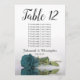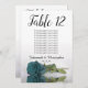 These beautiful table number cards will make it easy for your guests to find their seats at your wedding reception. They feature a simple yet elegant design with script calligraphy lettering and a single long-stemmed teal or turquoise coloured rose lying on its side reflecting in water. The card includes a seating chart with 10 names. There is also space for the couple's names and wedding date. This card is available in a variety of sizes and is larger than our standard table number cards.