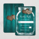 Rustic teal wedding RSVP card featuring a mason jar with two burlap hearts on a rustic wood background.