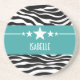 Trendy and modern Sassy Star Zebra Sandstone Coaster featuring a chic black and white zebra print background and a bold turquoise border adorned with a fun star motif. This girly design may be customised with the personalised text of your choosing. Click "Customise It" to find more personalisation options.