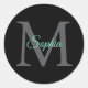 Teal Script Name, Large Grey Monogram on Black Classic Round Sticker