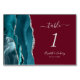 The left-hand edge of this elegant modern wedding table number card features a teal blue watercolor agate border trimmed with faux silver glitter. The customisable text combines silver grey handwriting, italic and copperplate fonts on a burgundy background.