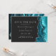 The right-hand edge of this elegant modern save the date card features a teal blue watercolor agate border trimmed with faux silver glitter. The customisable text combines silver grey serif and copperplate fonts on a dark background. The reverse side features a matching teal and silver agate design.