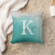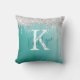 Teal turquoise aqua throw pillow with brushed metallic background and silver glitter drip border personalised with a white monogram initial and handwritten script name in teal. Ideal gift for the one who likes a little sparkle or decorating a room in a trendy cool style. Contact the designer via Zazzle Chat or makeitaboutyoustore@gmail.com if you’d like this design modified, on another product or would like coordinating items.