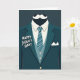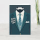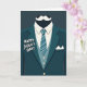 This design shows a stylized upper torso dressed in a deep teal suit jacket over a lighter teal vest and a crisp white shirt, giving the figure a polished, date-night kind of charm 👔. A striped tie in blue-green tones runs down the center, guiding the eye like a neat line between two close friends sharing a quiet laugh. The background sits in a slightly darker teal, so the clothing layers stand out with gentle shading that feels like stacked cut paper. A bright white pocket square peeks from the jacket, adding a small, tender touch like a thoughtful detail someone notices up close. Small gold buttons dot the vest, bringing a warm glint that softens the formal look. Where a head would be, a curled white mustache shape floats above the collar, giving the character a light, affectionate personality without showing a face 👨. The main message, “HAPPY father’s DAY!”, appears prominently across the design with “HAPPY” and “DAY!” in darker teal and “father’s” in a lighter contrasting tone. The mustache sits centered above the collar, crisp and white against the darker teal backdrop.