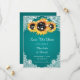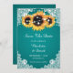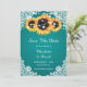 Teal rustic floral wedding save the date cards featuring sunflowers on a teal background adorned with white floral lace and string lights. Matching items available.