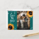 Rustic floral save the date photo postcards featuring sunflowers and string lights on a burlap background. Ideal card design for a teal rustic wedding party inspired by sunflowers.