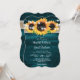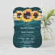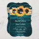 Teal rustic floral wedding invitation featuring sunflowers, burlap and lace against barn wood background adorned with string lights. Perfect card design for inviting your guests to your teal rustic wedding party inspired by sunflower flowers.