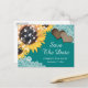 Personalised rustic teal and sunflower wedding save the date postcards featuring sunflowers and eucalyptus on a teal background adorned with burlap hearts, white floral lace and string lights. Ideal card design for your teal rustic country, backyard, or barn wedding party inspired by sunflower flowers. Matching items available.