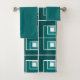 This towel set has a teal washcloth, a lighter teal hand towel, and a bath towel with a geometric design made from Ls in shades of teal laid in different directions repeating across the design.