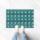 This doormat has a geometric design made from Ls in shades of teal laid in different directions repeating across the design.
