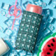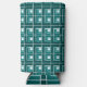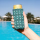 This seltzer can cooler has a geometric design made from Ls in shades of teal laid in different directions repeating across the design.