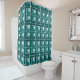 This shower curtain has a geometric design made from Ls in shades of teal laid in different directions repeating across the design.