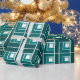 This wrapping paper has a geometric design made from Ls in shades of teal laid in different directions repeating across the design.