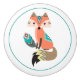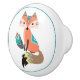 A colourful, cute fox wears boho style tribal attire and holds a pattern feather on this ceramic drawer knob. The image, in orange and turquoise, is placed on a white background, and ringed with a thin teal circle.