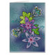 Create your own greeting, or just brighten the day of a friend or family member with this beautifully decorated greeting card. Bright and colourful floral design, inspired by henna mehndi patterns, features stylised tulips, daffodils, maple leaves and vines in colours of violet, teal, blue, and green.