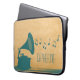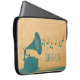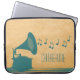 Quirky and unique Vintage Gramophone Electronics Bag in teal featuring a silhouette of an old-fashioned gramophone and a cascade of musical notes on a digital art rendered paper background. This chic laptop sleeve will protect your gadget with a dash of vintage flair and is perfect for any music lover. Easy to customise, simply personalise with the text of your choosing. Click on the "Customise It" button to find additional personalisation options.
