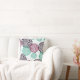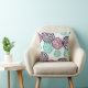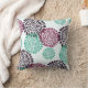 This throw pillow features a pattern of art deco mum floral images in tones of purple, violet pink, and teal blue. The pattern is placed on an off-white background and repeated on the back of the pillow.