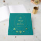 Add an elegant touch to your special day with this teal wedding foil guest book. Real foil features a raised texture. The front features a rose design along with the date and names of the wedding couple. Just change the text to fit your needs. Use the template to personalise.