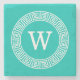 Teal White Greek Key Round Frame Initial Monogram Stone Coaster