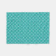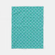 Fleece blanket in turquoise teal blue and white Moroccan quatrefoil lattice pattern.