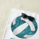 This fun volleyball themed beach towel features a pattern of teal and white stylised volleyballs arranged in a mirrored pattern with customisable text between the volleyballs, currently team name & mascot name - the athlete's name and jersey number can be personalised, as well as the white background colour - by katz_d_zynes