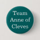 A turquoise badge with white text reading "Anne of Cleves". Anne of Cleves was the fourth wife if King Henry VIII of England. She was the second one to be divorced, and spent the rest of her life living peacefully in England.
