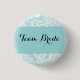 - Bachelorette Party Button with blue background and lace accent border.