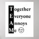 If you are over group projects and office small talk, bring a dose of sarcastic truth to your workplace with this bold black and white typography poster. Featuring the snarky redefinition of “TEAM” as “Together Everyone Annoys Me”, this minimalist print is great for cubicles, home offices or shared workspaces, where a little humour goes a long way. A fun conversation starter (or warning sign), this poster is available in both print and instant download.