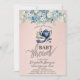 Cute baby shower invitation features watercolor blue teapot, blueberry and flowers on pink background. These baby shower invitations are easily customised for your event by simply adding your details.