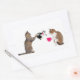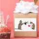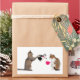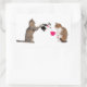 Portrait of two cats facing each other, one raised on its hind legs carfully pouring from a ceramic cat charicture teapot into a pink cup held by the second, as they enjoy their teatime