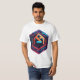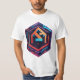 Futuristic t-shirt design with a geometric logo in a hexagonal frame. Vibrant colours and tech-inspired details create a modern, edgy look.