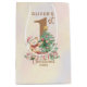 Adorable watercolor illustration celebrating a baby’s first Christmas. The design features a large brown “1st” with the word “Christmas” written below in a matching script. A cute teddy bear wearing a Santa hat and red scarf stands beside a decorated Christmas tree adorned with red and gold ornaments, topped with a golden star. Wrapped presents with red ribbons and festive greenery complete the cosy holiday scene. A warm and charming artwork full of Christmas spirit.