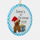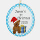 Baby's first Christmas ornament with image of cute teddy bear wearing Santa hat with present and a blue plaid background.