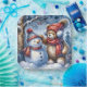 A cosy scene features a teddy bear and a snowman dressed in matching red hats and scarves enjoying a winter wonderland