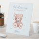Tabletop sign featuring a sweet blue teddy bear with a matching blue bow and soft blue stars on a light baby blue background. Customize with the Mother-to-Be's name.