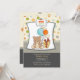 An adorable invitation featuring a stuffed teddy bear holding balloons. The unique background is layered with colourful polka dots, stripes and has a decorative panel with the words "baby shower".