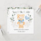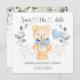 This design features a friendly Teddy Bear with blue bow and heart balloon. He is surrounded by greenery foliage. Texts Save the Date is written in calligraphy style.