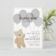 This cute "a little bear is on the way" gender-neutral baby shower invitation features a white background with a teddy bear with grey balloons. The reverse side features a light grey background with patterns of teddy bears, feeding/nursing/baby bottles, pacifiers and stars. Personalise for your needs. You can find more matching products at my store.