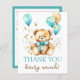 Cute fluffy teddy bear with a bow bearly wait aqua blue gold brown with balloons gold sprinkles baby shower thank you card