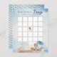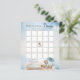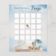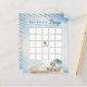 It's a Boy and We Can Bearly Wait Baby Shower "Bingo" script text game design featuring a cute little bear dressed in a blue raincoat witha blue umbrella. He is sitting beside a water puddle playing with his wooden blocks among the reeds, grasses and mushrooms. Composite design by Holiday Hearts Designs.