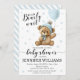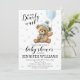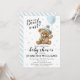 Cute brown blue teddy bear with balloon invitation for baby shower.