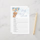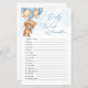 This design features a friendly Teddy Bear with blue and cream balloons. Text "Baby Word Scramble" is written in modern calligraphy font. Unscramble the baby words. The Answer Key: Baby Powder, Bottle, Blanket, Diapers, Lullaby, Car Seat, Thermometer, Shampoo, Pacifier, Rattle, Bassinet, High Chair, Baby Monitor, Stroller, Nursery, Rocking Chair