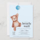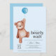 A baby shower "we can bearly wait" invitation featuring a teddy bear and blue balloon for a baby boy. Matching items available in the Teddy Bear Baby Shower Theme collection.