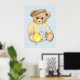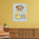 Adorable nursery design with a cute Teddy Bear wearing a Tam. Cute dancing yellow chick and blue toy bunny friends are nearby. Pastel blue plaid background. Would be a sweet addition to a lnursery.