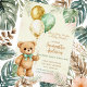 Celebrate your new arrival with this charming and whimsical baby shower invitation! This design features an adorable, hand-painted watercolor teddy bear wearing a mint green bow, holding a bunch of festive gold and sage green balloons. Framed by soft tropical monstera leaves and palm fronds, this invite perfectly blends a classic childhood theme with a trendy, botanical boho vibe.
