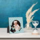 Lovely custom baby photo plaque, with build in stand, done in a style aqua and white quatrefoil pattern frame. Graphics of a cute brown teddy bear with a big aquamarine bow, decorates the bottom left corner of the circular photo area. Dark brown custom text, on the right bottom of the frame, is ready to personalise.