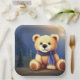 On this paper plate, you can see a charming beige teddy bear wearing a blue scarf, sitting in front of a picturesque forest. The bear's black eyes, nose, and mouth give it a playful charm, while its brown feet and ears create a lovely contrast against its beige fur. This design is a delightful addition to any party or event, bringing a cosy and welcoming atmosphere to the table. Whether it's a birthday party, picnic, or family gathering, this teddy bear paper plate is sure to put a smile on everyone's face.