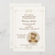 A unisex invitation with a pin stripe background and a delicate frame featuring a teddy bear hugging his toy giraffe. Well-suited for baby showers and birthday parties. Background design by Vecteezy - hollymolly.